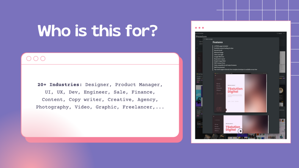 - 20+ Industries: Designer, Product Manager, UI, UX, Dev, Engineer, Sale, Finance, Content, Copywriter, Creative, Agency, Photography, Video, Graphic, Freelancer,...
